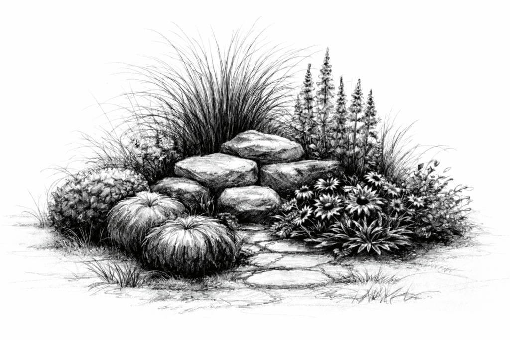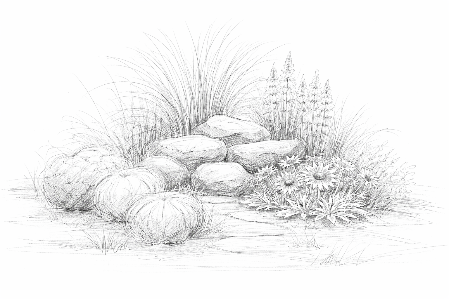See sketch below where we have set up the sketch of the planting group using 2H/H pencils.